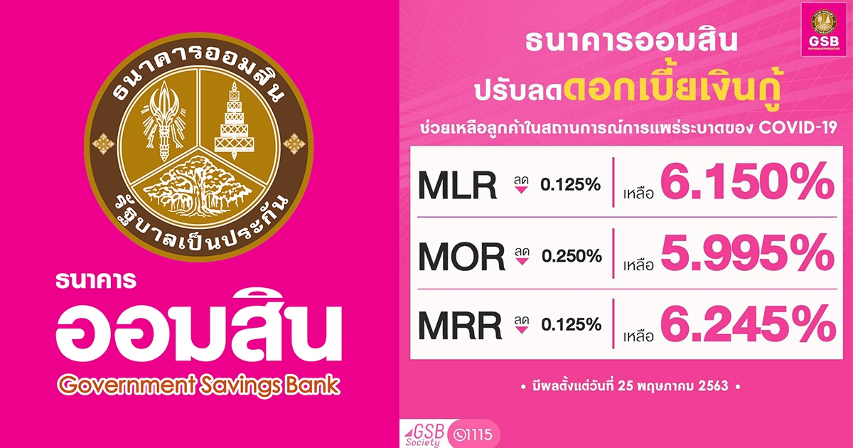ออมสิน ปรับลดดอกเบี้ยสอดคล้อง กนง. ลดดอกเบี้ยเงินกู้ 0.125-0.25% ไม่ปรับดอกเบี้ยเงินฝาก