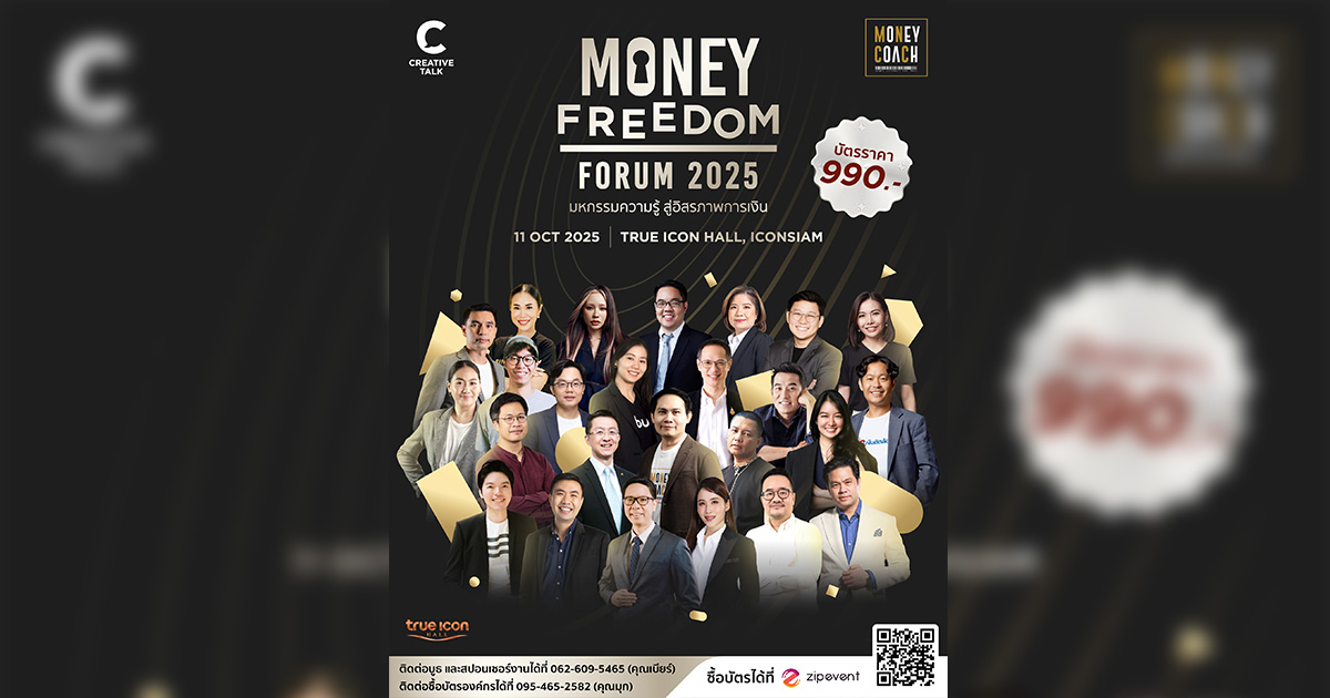 อยากเปลี่ยนวิธีคิดเรื่องเงิน อยากรู้เคล็ดลับอิสรภาพทางการเงิน มาเจอกันที่งาน Money Freedom Forum 2025 ฟังจากกูรูตัวจริงที่พร้อมแชร์ประสบการณ์และเทคนิคที่ทำได้จริง 11 ต.ค. นี้ ที่ ICONSIAM “เก็บเงินได้ แต่ไม่เคยเหลือ” “ออมก่อนใช้ แต่สุดท้ายก็ถอนไปจ่ายค่าข้าวอยู่ดี” “วางแผนแล้ว แต่เงินก็ไม่พอใช้อยู่ดี” ถ้าคุณรู้จัก “ความพยายามทางการเงิน” เหล่านี้ดี แต่ไม่แน่ใจว่าทำไมถึงยังไม่เห็นปลายทางของ “อิสรภาพ” มาลองฟัง และมาหาคำตอบด้วยตัวเองที่งานนี้ ! เตรียมพบกับงาน “Money Freedom Forum 2025 มหกรรมความรู้ สู่อิสรภาพการเงิน” จัดโดย Money Coach และ CREATIVE TALK งานที่ต้องการเปิดทางสู่ “อิสรภาพทางการเงิน” ให้คนไทยหลุดพ้นจากปัญหาทางการเงิน หาแนวทางการแก้ปัญหา สร้างมุมมองใหม่เพื่อต่อยอดการเงินให้งอกเงย และเดินทางสู่อิสรภาพทางการเงินอย่างยั่งยืน พบกับเนื้อหาที่ไม่ได้มีแค่แนวทางการวางแผนการเงิน แต่มาครบทั้ง Mindset – Skillset – Lifestyle เพื่อพาคุณไปสู่คำว่า “อิสระ” ที่จับต้องได้ พร้อมกับ Speaker ที่จะมาแชร์ความรู้ทางการเงินอย่างใกล้ชิด นำโดย 1. จักรพงษ์ เมษพันธุ์ (โค้ชหนุ่ม) - เจ้าของเพจ Money Coach 2. กวี ชูกิจเกษม - Value Investor 3. กษิดิศ สตางค์มงคล - Senior Data Analyst จาก DataRockie และ SAMSUNG 4. กันต์ จุโลทก - Executive Vice President AURORA TRADING CO.,LTD. 5. ชยนนท์ รักกาญจนันท์ - FINNOMENA 6. ดร.วิทย์ สิทธิเวคิน - Host ประจํารายการ 8 Minute History 7. ดร.วิโรจน์ จิรพัฒนกุล - Co-Founder and Managing Director, Skooldio 8. ดุจดาว วัฒนปกรณ์ - Founder of Empathy Sauce and SOULSMITH 9. ธนัชภรณ์ นิชิยาม่า (นาโอมิ) - Moderator and Video Content Creator FINNOMENA / Founder Page : Naomi - นาโอมิ 10. ธิษณา ธิติศักดิ์สกุล - CEO & Co- Founder Noburo Platform Co., Ltd. 11. ธีระฑัต หนูดำ - COO Laglace ผู้บริหารฝั่งกลยุทธ์ แบรนด์ลากลาส / เจ้าของเพจ คยต Live - ใดๆในโลก ล้วนการตลาด 12. ผศ. ดร.อุดมศักดิ์ รักวงษ์วาน - อาจารย์ภาควิชาคณิตศาสตร์ มหาวิทยาลัยเกษตรศาสตร์ เจ้าของเพจ ติดเล่า เรื่องลงทุน 13. ผศ. ดร.ยุทธนา ศรีสวัสดิ์ - CEO & Founder, iTAX 14. พรทิพย์ กองชุน - Chief of Growth Jitta Wealth 15. พิริยะ สัมพันธารักษ์ - Managing Director CDC ChalokeDotCom Co-founder Right Shif 16. มทินา วัชรวราทร - Head Investment Strategy, KAsset / ผู้บริหารฝ่าย กลยุทธ์การลงทุน บลจ กสิกรไทย 17. มิ่งขวัญ ประเสริฐศิวพร - ผู้นำสายงานด้านการส่งเสริมความยั่งยืนทางสังคม (Social Impact Lead) 18. รศ. ดร.ธานี ชัยวัฒน์ - Chairman of Political Economy Program and Director of Chulalongkorn Center for Behavioral and Experimental Economics 19. รศ. ดร.อธิภัทร มุทิตาเจริญ - อาจารย์ประจำคณะเศรษฐศาสตร์ และผู้อำนวยการศูนย์วิจัยเศรษฐศาสตร์ จุฬาลงกรณ์มหาวิทยาลัย 20. ศักดา สรรพปัญญาวงศ์ - Co-Founder & CEO Avenger Planner 21. สราวุธ เฮ้งสวัสดิ์ - นักเขียน นามปากกา นิ้วกลม 22. สุรพล โอภาสเสถียร - President of NCB 23. สุวัธนา รัศมีโรจน์วงศ์ - First Voice President Debt Clinic Department SUKHUMVIT ASSET MANAGEMENT CO., LTD. 24. เอมลินทร์ ธีรธนากิตติพงษ์ - CEO Laglace 25. แทนรัก เชียงทอง - CMO BINANCE TH #MoneyFreedomForum2025 #มหกรรมควา