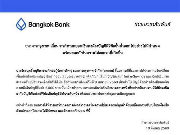 แบงก์กรุงเทพ ยอมถอย เลื่อนกฎเงินฝากขั้นต่ำ 2,000 บาท บัญชีดิจิทัล แจงที่มามาตรการ