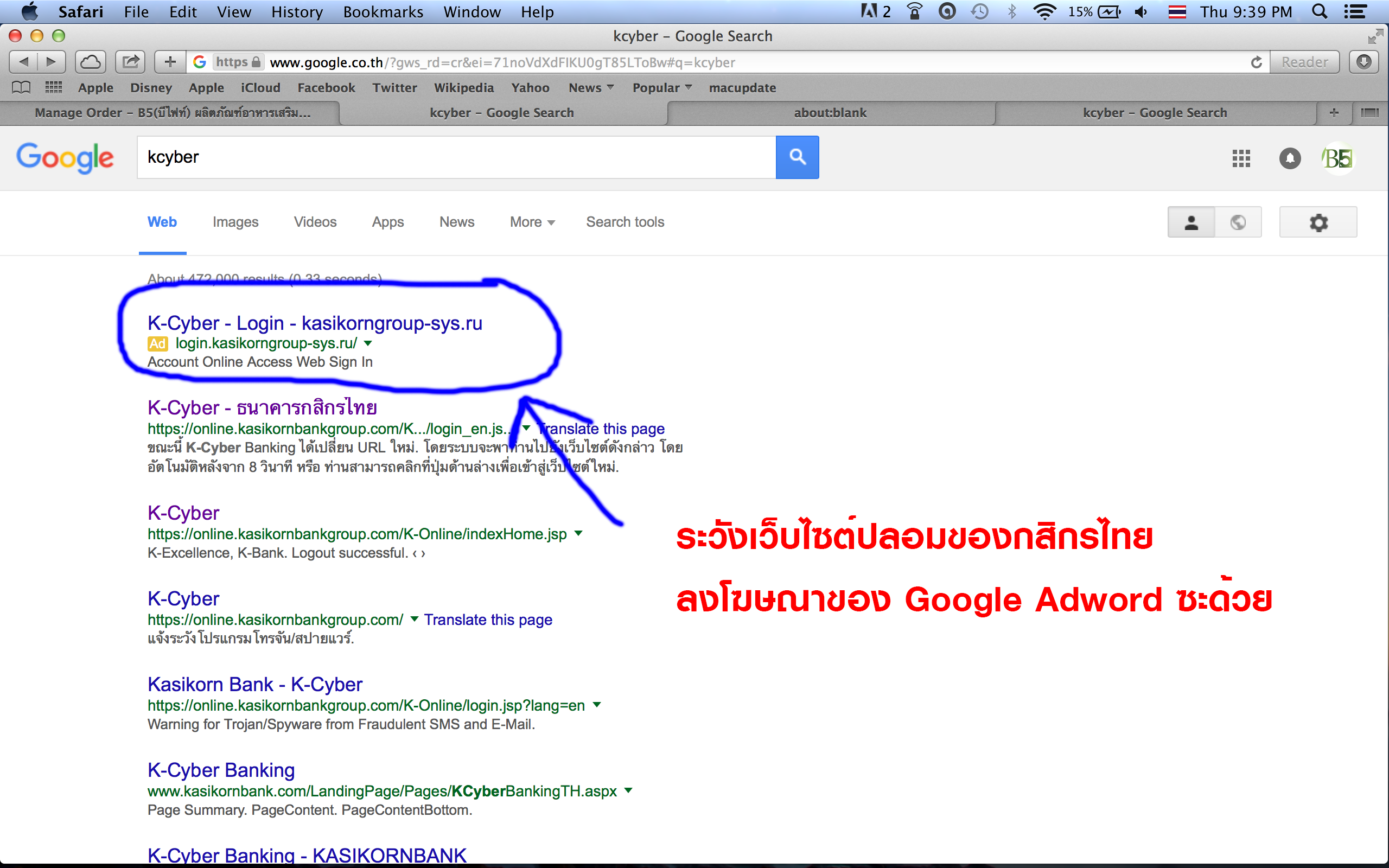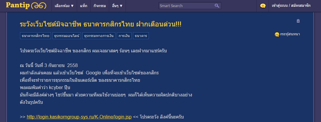 เมื่อวันที่ 4 กันยายน 2558 ผู้สื่อข่าวรายงานว่า สมาชิกพันทิป ThailandEazy ได้แชร์ประสบการณ์เตือนภัยเกี่ยวกับเว็บไซต์ปลอม โดยระบุว่า โปรดระวังเว็บไซต์มิจฉาชีพที่ทำเว็บไซต์เลียนแบบธนาคารกสิกรไทย เนื่องจากวันที่ 3 กันยายนที่ผ่านมา ตนเองได้เข้าหน้า Google เพื่อที่จะค้นหาเข้าสู่เว็บไซต์ของธนาคารกสิกรไทย โดยพิมพ์คำว่า “kcyber”