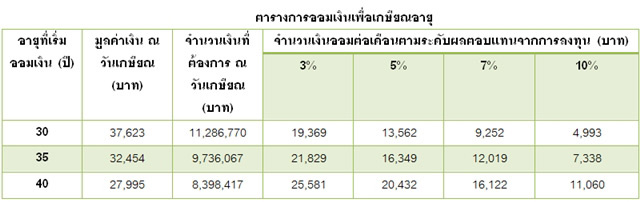 ประเด็นสำคัญของการออมเงินเพื่อเกษียณคือ ยอดเงินออมในแต่ละเดือนค่ะ เพื่อให้รู้ว่า เราสามารถออมเงินเพื่อให้เกษียณอย่างสุขสบายได้หรือไม่ จากตารางการออมเงินเพื่อเกษียณอายุด้านล่างจะเห็นว่า หากเราเริ่มออมตั้งแต่อายุ 30 ปี เพื่อเป้าหมายมีเงินในช่วงเกษียณอายุ 11.3 ล้านบาท ยอดเงินออมจะอยู่ที่ประมาณเดือนละ 5,000-19,000 บาท ขึ้นอยู่กับว่า เรารับความเสี่ยงจากการลงทุนได้มากน้อยแค่ไหน