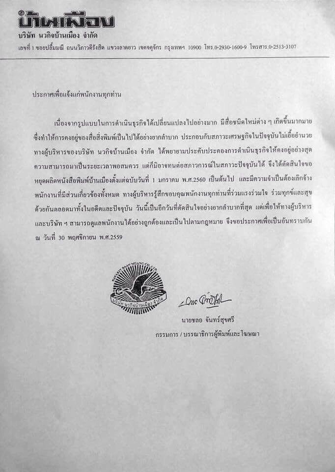 ปิดตำนานหนังสือพิมพ์บ้านเมือง เลิกจ้างพนักงานตั้งแต่ 1 มกราคม 2560 หลังประสบสภาวะทางธุรกิจที่เปลี่ยนแปลงไป