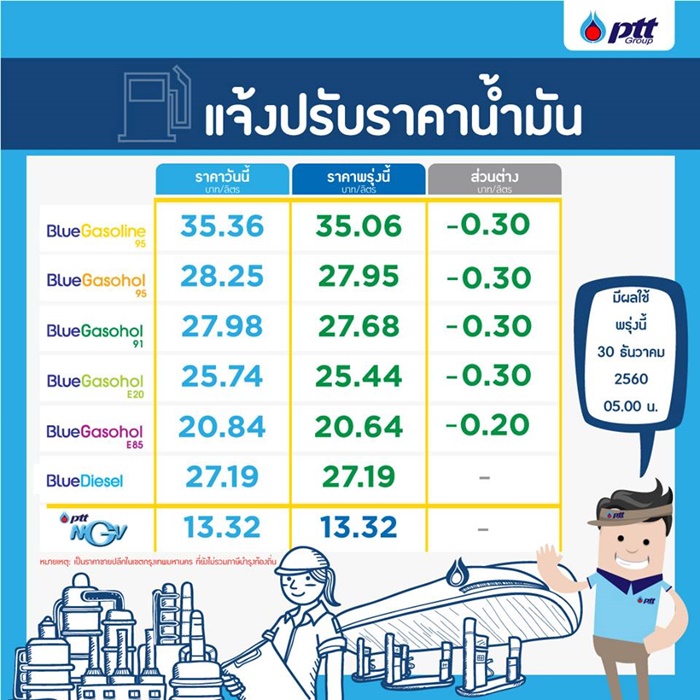 วันที่ 29 ธันวาคม 2560 บริษัท ปตท. จำกัด (มหาชน) ประกาศปรับลดราคาขายปลีกน้ำมันกลุ่มเบนซิน, แก๊สโซฮอล์ 91, 95 และ E20 ลง 30 สตางค์ต่อลิตร ส่วน E85 ลง 20 สตางค์ต่อลิตร ส่วนดีเซลคงเดิม โดยจะมีผลตั้งแต่เวลา 05.00 น. ของวันที่ 30 ธันวาคม 2560