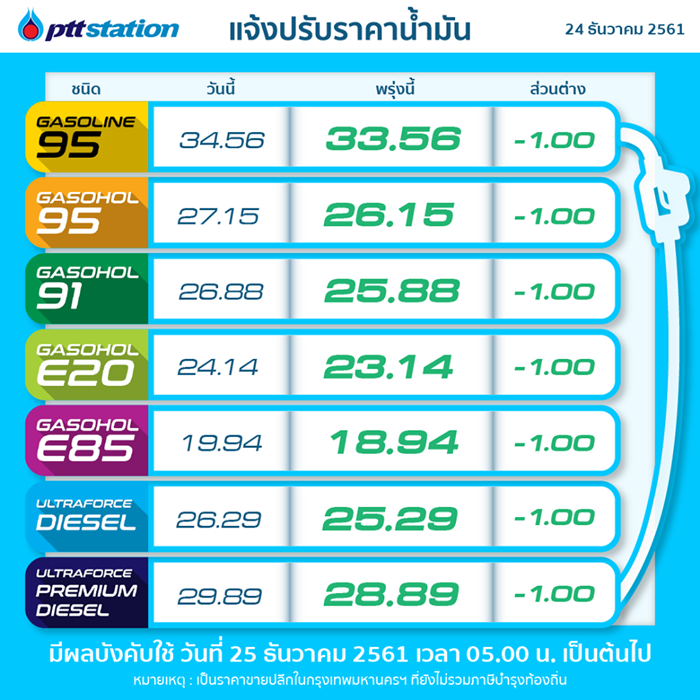 กรรมการบริหารนโยบายพลังงาน มีมติลดราคาน้ำมันทุกชนิด 1 บาทต่อลิตร โดยจะมีผลในวันที่ 25 ธันวาคม 2561 ตั้งแต่เวลา 05.00 น.