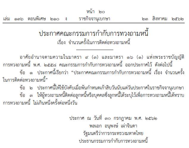 กฎหมายทวงหนี้บังคับใช้แล้ว ห้ามเจ้าหนี้ทวงหนี้เกิน 1 ครั้งต่อวัน จันทร์-ศุกร์ ทวงได้ 8 โมง-2 ทุ่ม วันหยุดราชการ ทวงได้ 8 โมง-6 โมงเย็น ยกเว้นกรณีเพื่อนยืมเพื่อน แบบนี้ทวงกี่ครั้งต่อวันก็ได้