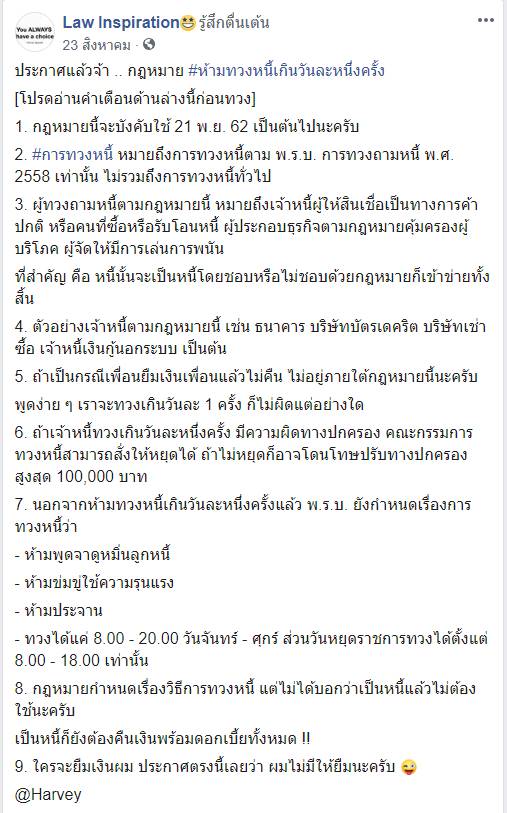 เกี่ยวกับเรื่องนี้ เฟซบุ๊ก Law Inspiration เคยโพสต์รูปรายละเอียดของ พ.ร.บ.การทวงถามหนี้ พ.ศ. 2558 ไว้ดังนี้