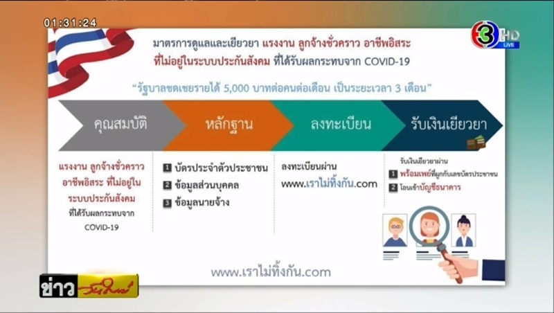 วันที่ 27 มีนาคม 2563 รายการข่าววันใหม่ รายงานว่า จากวิกฤตโควิด 19 ที่ส่งผลกระทบต่อคนจำนวนมาก ทำให้ขาดรายได้เนื่องจากตกงาน หยุดงาน โดยเฉพาะอาชีพอิสระที่ได้รับผลกระทบอย่างหนักจากการแพร่ระบาดของไวรัสโคโรน่า ซึ่งทำให้รัฐบาล ได้ออกมาตรการแจกเงินคนละ 5,000 บาท เป็นระยะเวลา 3 เดือน รวม 15,000 บาท ซึ่งท่านสามารถดูรายละเอียดได้ที่นี่ (สรุปทุกประเด็น ลงทะเบียนรับเงิน 5,000 ผ่านเว็บเราไม่ทิ้งกัน.com ใครมีสิทธิ์ได้บ้าง ?)
