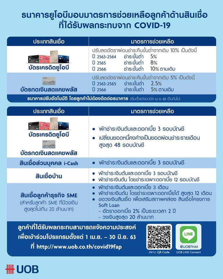 - พักชำระหนี้เงินต้น จ่ายแต่ดอกเบี้ย เป็นเวลา 3 เดือน (สำหรับยอดหนี้ไม่เกิน 3 ล้านบาท)