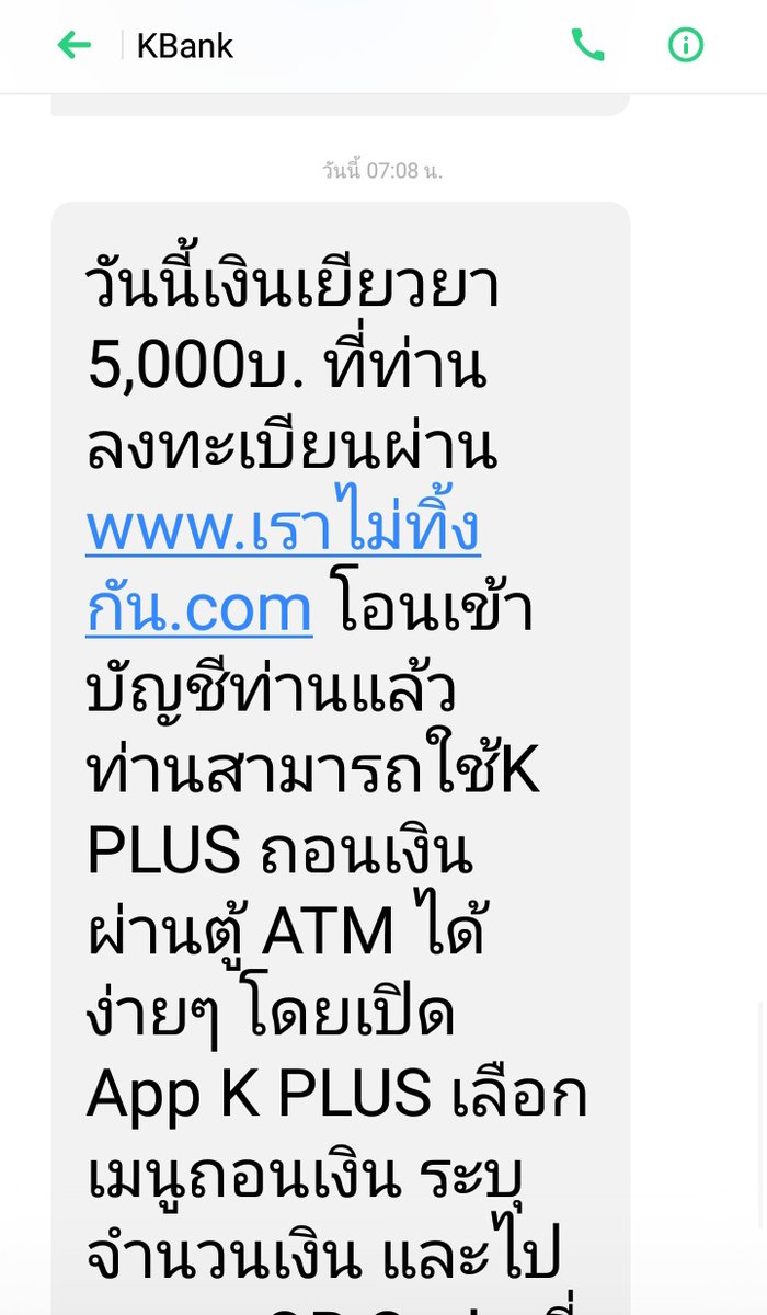 ผู้ที่ลงทะเบียนพร้อมเพย์ของธนาคารกสิกรไทย จะมีข้อความว่า "วันนี้เงินเยียวยา 5,000 บาท ที่ท่านลงทะเบียนผ่าน www.เราไม่ทิ้งกัน.com โอนเข้าบัญชีท่านแล้ว..."