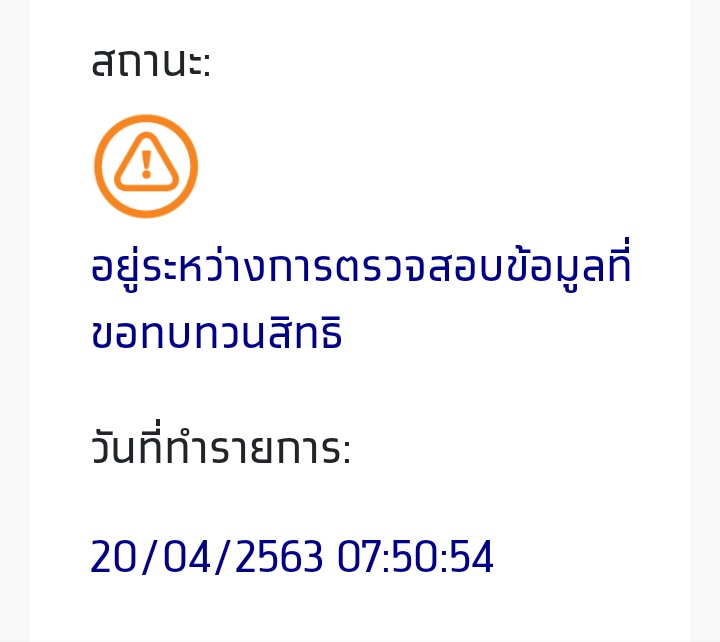 หากการลงทะเบียนของท่านเสร็จสมบูรณ์ สถานะจะโชว์ว่า "อยู่ระหว่างการตรวจสอบข้อมูลที่ขอทบทวนสิทธิ" เป็นอันเสร็จสมบูรณ์ ซึ่งขั้นตอนต่อไปหลังจากนี้ เพียงแค่รอเจ้าหน้าที่ไปตรวจสอบต่อไป