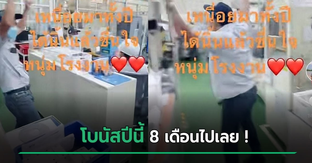 โดยเจ้าของคลิปได้โพสต์ข้อความว่า "ประกาศโบนัสได้ยินแล้วหายเหนื่อย #หนุ่มโรงงาน" เผยให้เห็นภาพพนักงานยืนฟังเสียงตามสาย ที่กล่าวขอบคุณพนักงานที่ทำงานด้วยความตั้งใจ พร้อมกับประกาศว่า โบนัสในปีนี้คือ 8 เดือน ซึ่งหลังเสียงประกาศก็มีเสียงเฮสนั่นด้วยความดีใจของพนักงานที่ตั้งตารอฟัง