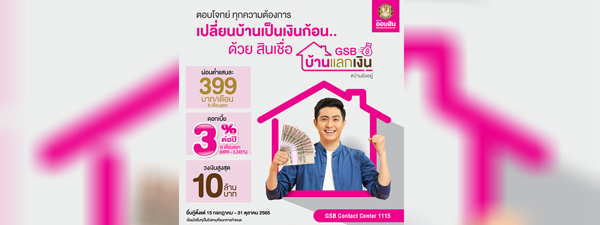 แค่มีบ้านก็เปลี่ยนเป็นเงินได้ แค่มีบ้านปลอดภาระก็ได้เงินก้อน ให้คุณตอบโจทย์ทุกความต้องการ...ด้วยสินเชื่อ GSB บ้านแลกเงิน #บ้านยังอยู่