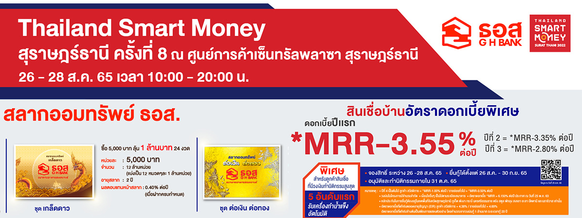 ทั้งนี้ ลูกค้าที่สนใจผลิตภัณฑ์ของธนาคารสามารถจองสิทธิ์ใช้บริการและขอรับคำปรึกษาจากเจ้าหน้าที่ของ ธอส.ได้ที่งาน "Thailand Smart Money สุราษฎร์ธานี ครั้งที่ 8" ระหว่างวันที่ 26-28 สิงหาคม 2565 ณ ศูนย์การค้าเซ็นทรัลพลาซา สุราษฎร์ธานี สอบถามรายละเอียดเพิ่มเติมได้ที่ ธอส.ทุกสาขาทั่วประเทศ G H Bank Call Center โทร 0-2645-9000 หรือ Facebook Fanpage ธนาคารอาคารสงเคราะห์ และติดตามข่าวสารของธนาคารได้ที่ Mobile Application : GHB ALL และ www.ghbank.co.th