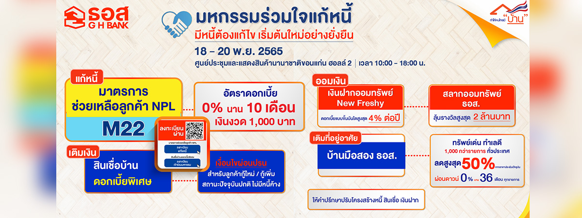 1.1. มาตรการ 22 [M22] : สำหรับลูกค้ารายย่อยสถานะ NPL หรือ ลูกค้ารายย่อยสถานะ NPL ที่อยู่ระหว่างการใช้มาตรการ/ปรับโครงสร้างหนี้ที่กู้เงินกับธนาคารมาแล้วไม่น้อยกว่า 1 ปี ให้ผ่อนเงินงวดต่ำพร้อมลดอัตราดอกเบี้ยเงินกู้พิเศษ 2 ปี เดือนที่ 1-10 ชำระเพียงงวดละ 1,000 บาท ดอกเบี้ย 0% ต่อปี (ตัดชำระเงินต้นทั้งหมด)