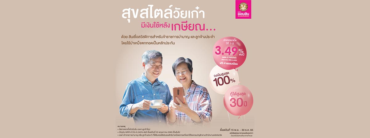 สายเก๋าอุ่นใจ มีเงินใช้หลังเกษียณ กับ สินเชื่อสวัสดิการสำหรับข้าราชการบำนาญและลูกจ้างประจำ โดยใช้บำเหน็จตกทอดเป็นหลักประกัน ผ่อนสบายสูงสุด 30 ปี