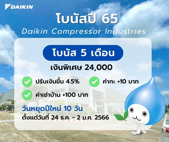 บริษัท ไดกิ้น คอมเพรสเซอร์ ระยอง ประกาศแจกโบนัส 2565 ให้พนักงานจุก ๆ 5 เดือน + เงินพิเศษ 24,000 + ค่าเช่าบ้าน + ปรับเงินขึ้น แถมหยุดยาว ๆ ปีใหม่ 10 วัน