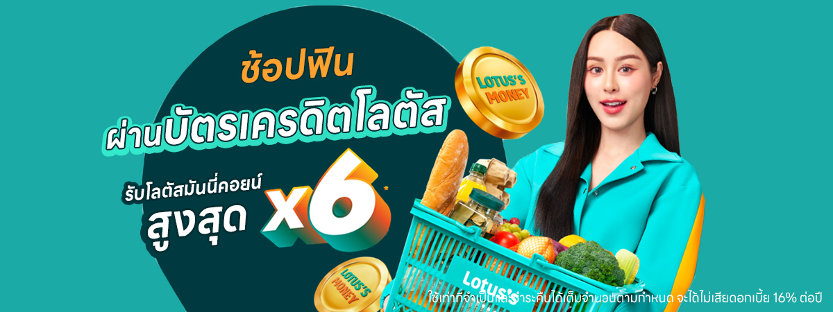 ช้อปฟินกับบัตรเครดิตโลตัส รับโลตัสมันนี่คอยน์สูงสุด 6 เท่า* ใช้จ่ายที่โลตัสหรือทั่วโลก แลกเป็นคูปองเงินสด สมัครวันนี้รับสิทธิพิเศษมากมาย