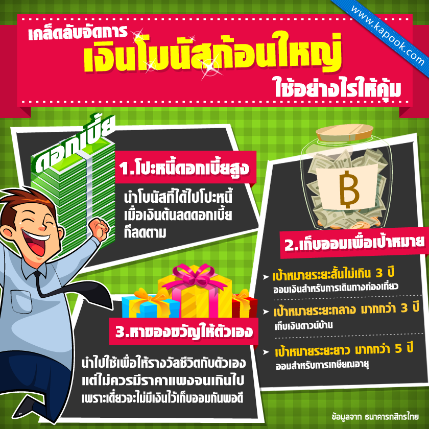 ในช่วงปลายปีถือเป็นช่วงเวลาทองของคนทำงาน ที่มักมีโบนัสก้อนใหญ่รออยู่ จะมากหรือน้อยก็แตกต่างกันไป แต่ทว่าหลายคนทำงานมาเนิ่นนาน ได้โบนัสมาก็หลายครั้ง แต่กลับปล่อยให้หมดไปอย่างน่าใจหาย เพราะไม่รู้จักวิธีจัดการโบนัสให้เป็น ปลายปีอย่างนี้กระปุกดอทคอมจึงขอนำเคล็ดลับดี ๆ จาก ธนาคารกสิกรไทย เพื่อจัดการเงินโบนัสก้อนใหญ่ของคุณให้มีประสิทธิภาพมาฝากกัน ลองทำตามเคล็ดลับเหล่านี้ดู รับรองจะใช้เงินโบนัสได้คุ้มค่ามากขึ้นแน่นอนค่ะ